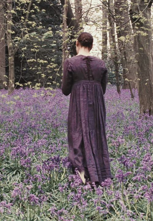 This effect occurs in film’s signature scene in which Fanny leaves her room to read a letter from Keats. Fanny wears an amethyst-colored dress. The field she steps into is carpeted with lavender-tinged bluebells. The foreground and background planes smudge around Fanny, gathering the viewer’s attention up into the scene, into the natural beauty that pervades Rom