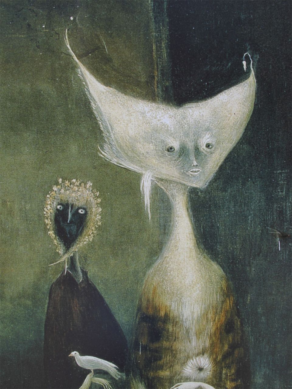 In L’art magique (1957), Andre Breton—an admirer of Carrington— enumerated Hieronymus Bosch’s earthly delights. The passage seems especially fitting of Carrington’s aspirations for Samain’s spirits as they become painting: This is the desire of the inhabitants of the Garden…I would like to have wings, a shell, bark; breathe smoke, have an elephant’s trunk, twist my body, be divided into many parts, be in everything, emanate like an aroma, develop like a plant, pour like water, vibrate like sound, shine like light, curl up under all forms, penetrate each atom… Painting was the medium by which Carrington extended vision toward the visionary. The spirits pushed back at this membrane, and on enchanted occasion, managed to pierce it. The painter grappled with the processes of transmutation and sublimation, trying to get beyond the five senses that weigh heavy on the page and burden readers, like Jumart and Drusille, with all-too-human bodies.