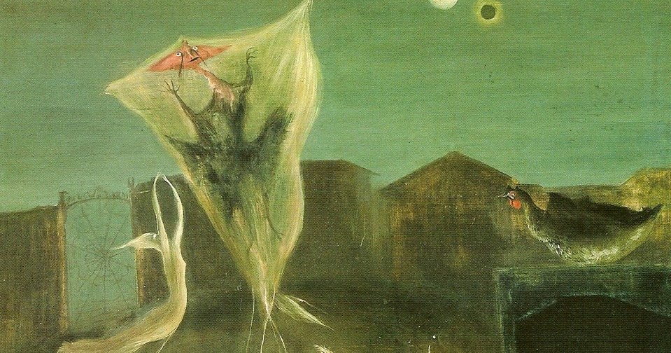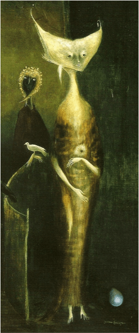 Carrington created between 1500 and 2000 works of visual art, and scholars—Whitney Chadwick and Susan Aberth, the most probing among them—have attended to a portion of her prolific output. The body of work contains many murky, twilit paintings, ciphers; many that hold the traces of a dark struggle, or that seem unfinished or unresolved. Those are the paintings, one would suspect, that she made for herself. One such painting is Samain (1951). It conjures up a peculiar sorority. I’ve set alongside Carrington’s short story “The Sisters” (1939). While separated by a dozen years, the choice for comparison is based on thematic affinities. The space between these two works leaves generous room for musing, but far less for sustained argument.